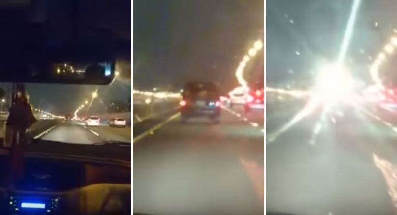 影片中,王姓駕駛的車輛與前方的廂型車距離大約有2到3輛車遠,這時車上的乘客突然開口討論起前車的煞車燈,「他都沒有踩煞車」、「只要一踩就很刺眼」,話才剛說完畫面中央就出現一大團白光,刺眼的亮度幾乎讓後車駕駛看不清楚前方路況,「太誇張,煞車刺人家眼睛」、「這太亮了,超危險的」。