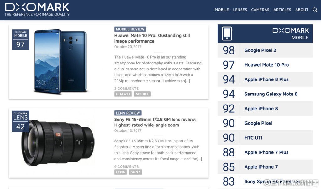 華為日前在德國慕尼黑發表的徠卡認證雙鏡頭旗艦手機 Mate 10 Pro,拍攝效能方面,DxOmark 給出了初步的評測結果,總評分 97 分,僅次於獲得 98 高分的 Google 新機 Pixel 2,卻遠勝於 Galaxy Note8 與 iPhone 8 Plus 所獲得的 94 分,拍照方面跟三星 Galaxy Note 8 一樣,獲得 100 分的評價。