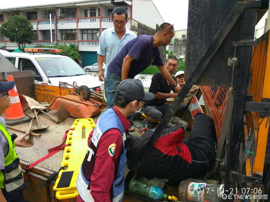 該工程車司機先聽到車禍巨響後,車後面也傳出碰好大一聲,感覺有東西掉在車上,趕緊停在路邊察看,發現竟有個人卡在車斗上道路施工標示器,嚇得急忙呼叫路人報案。