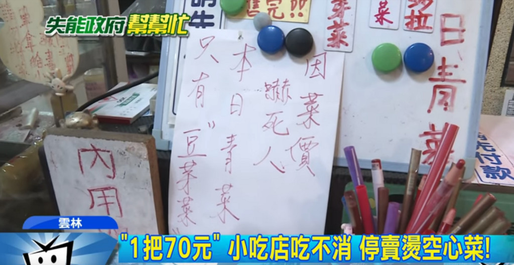 整把整把的豆芽菜丟進鍋裡燙,豆芽菜已經不是配料,「虎尾王家當歸鴨肉麵線」立出告示牌:「菜價嚇死人!只賣豆芽菜」,把平常燙青菜吃到的空心菜、地瓜葉全部改成豆芽菜。老闆無奈地說,因為青菜近兩周突然價差近1倍,上周約170元,這周就漲到300元。