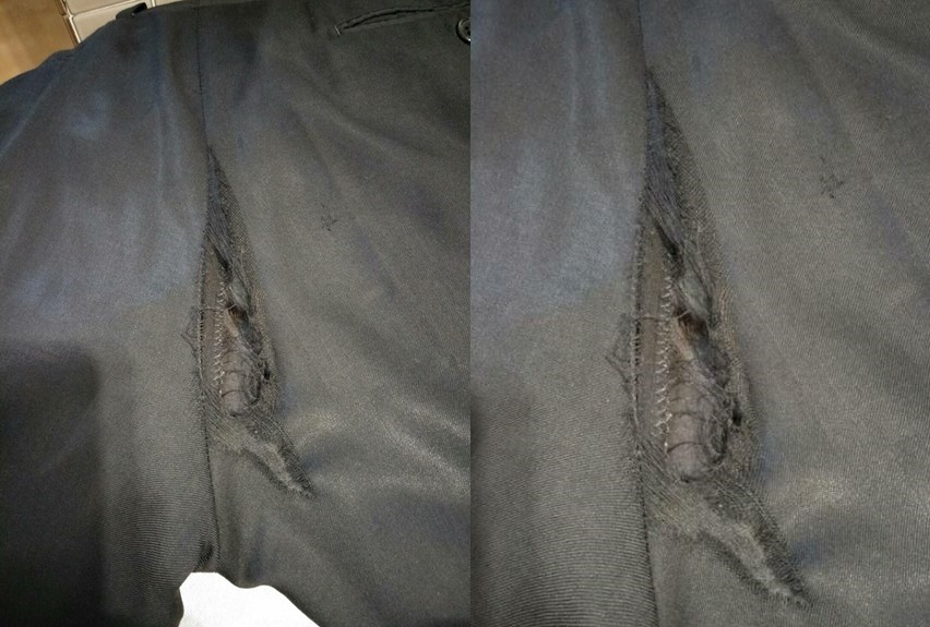 顧客媽媽要求把褲子送鑑定、賠償品牌禮券+商品金額,而且破洞褲子修補後必須要能穿,不然就會去消基會控訴。原PO的店長朋友相當無奈,因為褲子是材質羊毛51%西裝褲,當初客人購買時表示有練健身,對於服裝也要求合身,所以訂做成合身窄版,這樣當然容易造成摩擦。