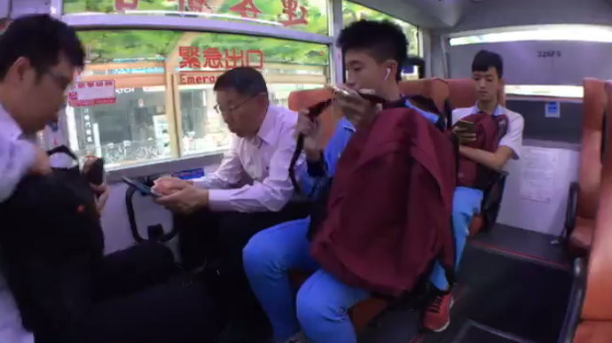 柯文哲上午7點提著公事包,走到住家附近的捷運東門站公車站牌等車。等了約8分鐘,柯文哲才搭上588公車。列車停靠大安站時,有一名男學生上車,本來坐在柯文哲旁邊,看了柯一眼後,覺得好像怪怪的,又馬上起身換到隔壁座位。柯見狀笑慘,直呼「不要害怕、不要害怕」。