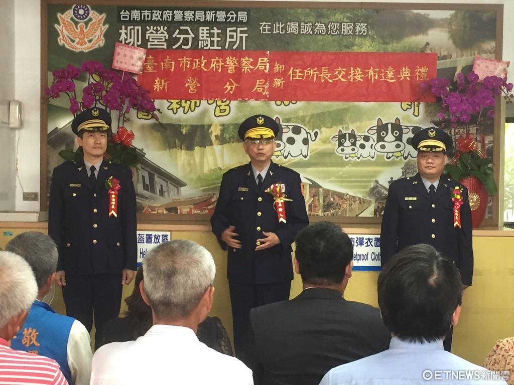 ▲台南市警新營分局分別在柳營及中山路派出所,舉行所長布達交接典禮,由新營分局長王森瑒親自主持。(圖/警方提供)