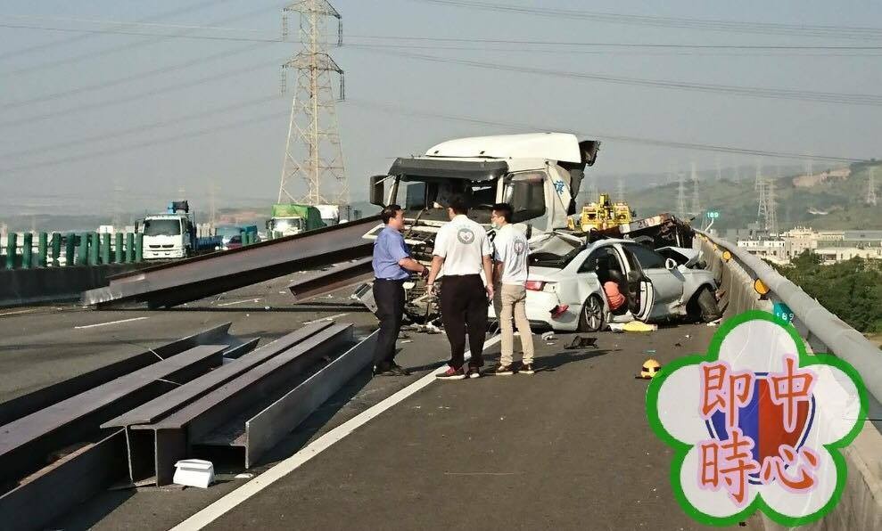 國道3號189公里處24日下午3時20分發生重大車禍。26歲東姓男子駕駛拖板車載著鋼材南下,行經龍井大肚路段時突然爆胎,失控越過分隔島衝進對向車道,當場將一輛白色奧迪自小客車輾成廢鐵。小客車駕駛林姓男子當場死亡,車上林妻和7個月大女嬰也慘遭重輾,到院時均有腦組織外溢出情形,搶救後均宣告不治。