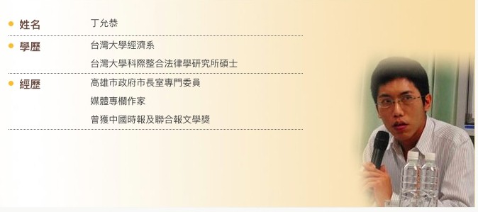 丁允恭現年41歲,畢業於台大經濟系、台大科際整合法律研究所碩士,曾為媒體專欄作家,並獲時報文學獎及聯合報文學獎;2008年起擔任高雄市長陳菊幕僚,並於2014年3月,接任高雄市政府新聞局長至今。