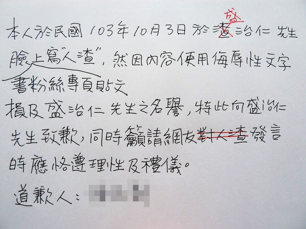 不料,陳男卻故意在道歉文中寫「本人於渣盛治仁先生臉書粉絲專業貼文寫人渣...」、「特此向盛治仁先生致歉,同時籲請網友對人渣發言時應恪遵理性及禮儀」等內容。其中「渣」、「人渣」字眼用紅筆劃X或劃上刪除線「訂正」,並po上盛的臉書頁面。