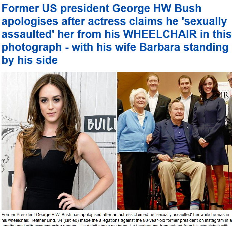 林德說:「當大夥兒合照時,他沒跟我握手,卻坐在輪椅上從後面摸我屁股, 當時他的妻子芭芭拉就在旁邊。他還跟我開黃腔。之後,拍照過程中他一再摸我。芭芭拉卻不斷翻白眼,彷彿在說:『又來了!』。他的保鑣告訴我,不應該在合照時 站在他身邊。」
