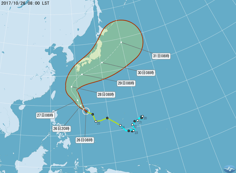 中央氣象局指出,今年第22號颱風蘇拉,今天2時中心位於鵝鑾鼻東南東方約1450公里之海面上,預側未來將往西北移行至琉球群島一帶,隨後將逐漸轉向朝日本南方海面前進,預估27及28日相對距離台灣較近,但其偏轉位置以及後期路徑仍存在變數。