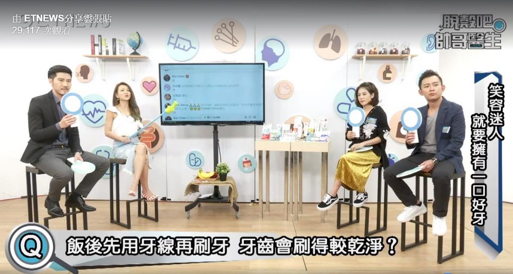 ▲《ETNEWS新聞雲》製播的直播節目《脫殼吧!帥哥醫生》,10月23日邀請了微笑正妹楊晨熙(右2)、帥哥牙醫蔣碩璋(右1)以及型男牙醫趙國翔(左1),在節目中探討每個人都會面臨的牙齒問題,並且打破各種潔牙迷思。(圖/翻攝自《脫殼吧!帥哥醫生》)