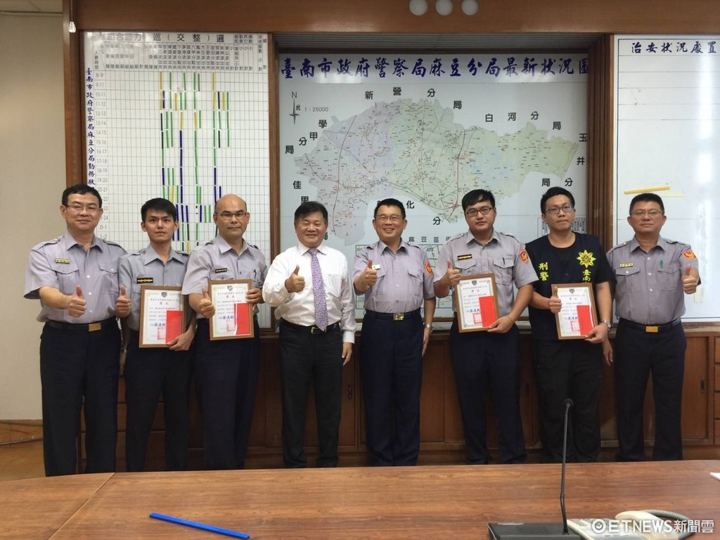 ▲台南市警麻豆分局長蔡進閱,利用主管會報,公開表揚106年第3季治安工作績優員警,並邀請警友辦事處主任張青鑑頒贈獎狀及慰問金。(圖/警方提供)