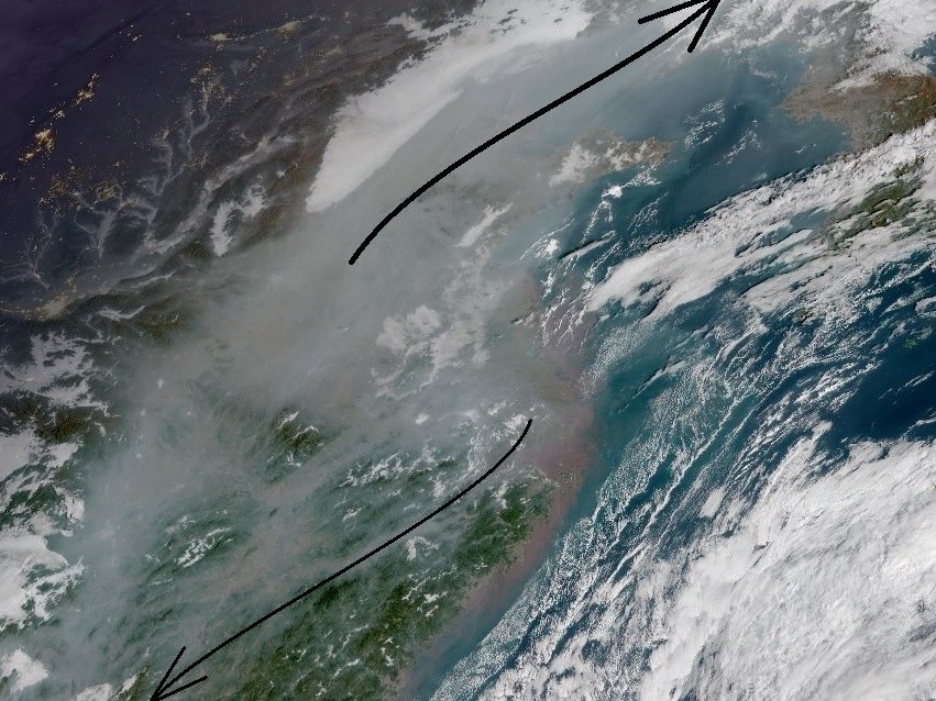鄭明典表示,由於太陽斜射情況,霾的光學影響會被放大,才會在清晨的真實色彩衛星影像中,看見分布明確的霧霾,「現在大陸華北的霾,主要是往東北方向擴散。華中、華南、西南地區是弱風區,霾的累積也很嚴重。」
