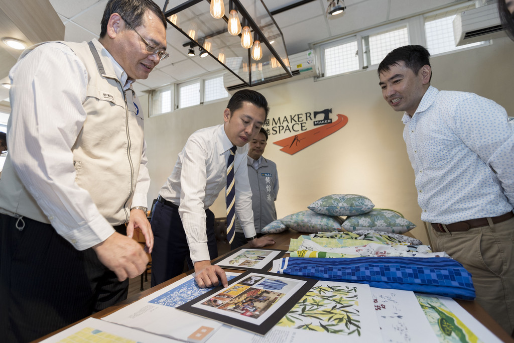 林智堅在勞動部勞動力發展署桃竹苗分署副分署長賴家仁陪同下,走訪「衣啟飛翔創客基地」,並訪視公益抱枕計畫、生態衣製作、浪漫臺三線印花設計成品等攤位,其中以新客家元素製成的印花衣服、抱枕等,顛覆過去大花大紅的客家印象,讓林智堅市長印象深刻。