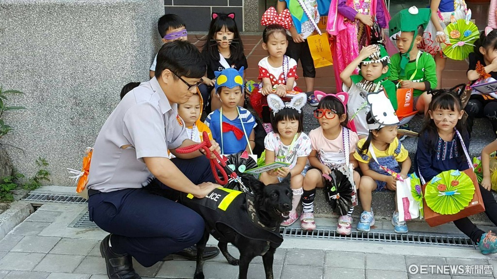 幼兒盛裝打扮成美人魚、小天使、小惡魔、蝴蝶、白雪公主、蜘蛛人等酷炫華麗造型,歡樂帶動唱,場面活潑可愛,在四分局前舉辦交通安全、婦幼安全宣導暨萬聖節活動,讓平時嚴肅的分局充滿不一樣的歡樂氣息。