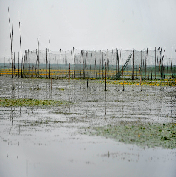 「迷魂陣」興起於上世紀90年代,是將連著小眼網片的竹篙插入湖中,圍住一片水域,只留一個入口,圍內安放數個網兜的捕魚裝置,是一種竭澤而漁的行為。位置好的漁民,通過「迷魂陣」一戶一年的漁獲量超過10萬斤。