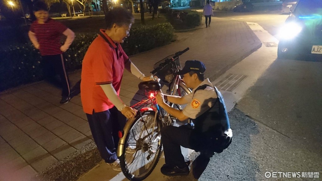 ▲台南市警三分局員警善用夜間、清晨巡邏及家戶訪查等機會,主動攔查並關懷高齡者,為其腳踏車裝設後座警示燈或配戴LED燈手環,以降低交通事故發生。(圖/警方提供)