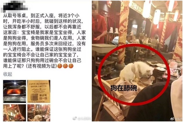 跟寵物一起吃飯是什麼滋味?江蘇常州市一名網友在朋友圈上爆料,自己和朋友到一間網紅火鍋店準備品嘗傳說中的「網紅火鍋」,沒想到換來不舒服的體驗,該網友抱怨,他們先是花了3個小時排隊,之後看到有客人帶著小狗上門,坐在嬰兒椅上的小狗還用餐廳的碗盤吃飯,讓人看了渾身不舒服。