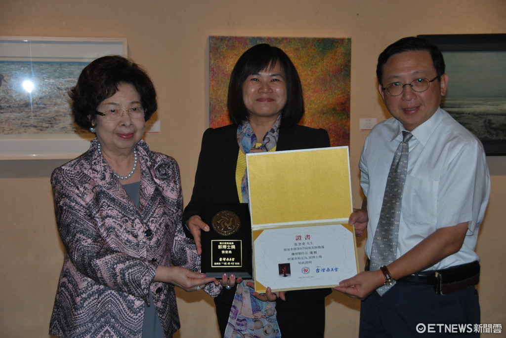 ▲台南市郭綜合醫院總裁夫人郭林欣欣(左一),院長郭宗正(右一),在南美展共同頒「郭博士獎」給雕塑類得主張登堯。(圖/郭綜合醫院提供)