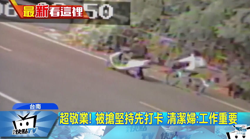 台南市一名洪姓陸配在醫院擔任清潔工,她上班途中被搶,第一時間竟不是報案,而是先去醫院打卡,因為她怕先去報警,工作會遲到。警方聽了都直呼好敬業。