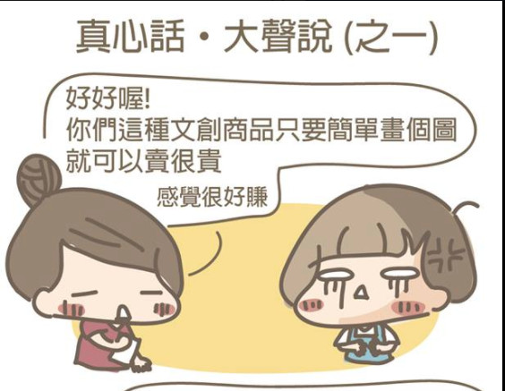 身為圖文插畫家,歐北貓邀約網友一起「真心話大聲說」並繪製情境,而他自己也分享到,若是看到一些文創商品「不買沒有關係,可是真的不要否定設計者的心血!文創其實不好賺,文創商品也不是隨便撇個幾筆就能交差的東西」。她分析,文創商品通常有兩要點,一是角色討喜度,這跟平常經營的個性有關,讓大家看到相關商品就會喜歡,另外就是商品本身的設計感。但每個設計都是嘔心瀝血的作品,也不是打扮得很文青去擺個市集就可以光鮮亮麗的賺錢。