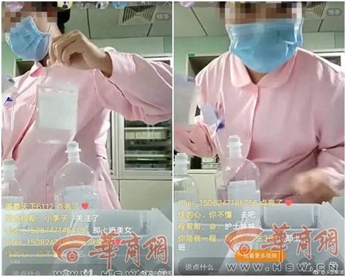 綜合陸媒報導,10月31日下午時,一名身穿粉色護士服、戴著黑框眼鏡、藍色口罩的年輕女子對著手機進行直播,一邊工作一邊跟網友們互動,有網友還要求她把口罩摘下來,該名年輕女子也照做,後來又把手機放在桌上,面對另外一名同樣穿粉色護士服的年輕女子,直播記錄她配藥的過程。