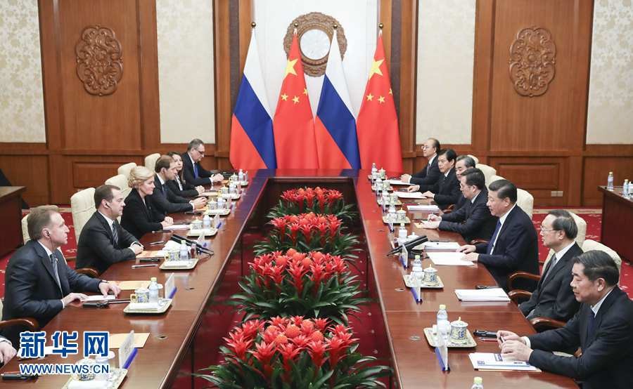 中國國家主席習近平於1日在釣魚台國賓館會見來訪的俄羅斯總理梅德維傑夫。他強調,雙方要加強能源、裝備製造、農業、航太等領域合作,做好「一帶一路」建設,努力推動濱海國際運輸走廊等專案,並共同開展北極航道開發與合作,打造「冰上絲綢之路」。