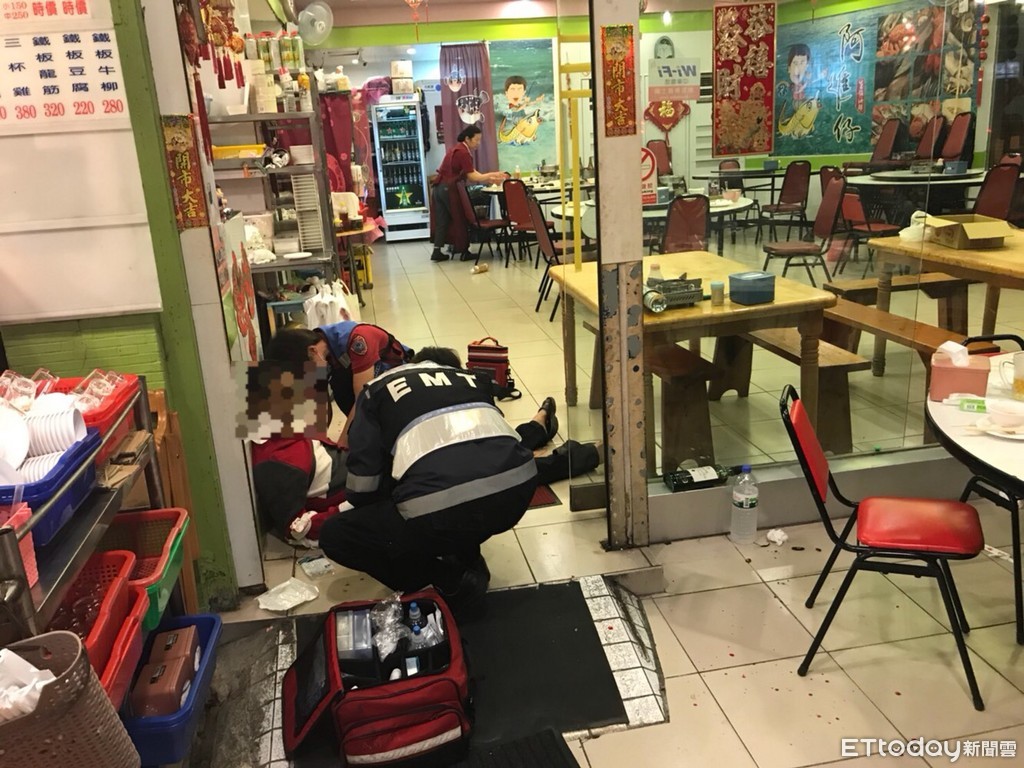 ▲葉姓被害人被人持刀砍殺,台南市消防局救護人員到場救護送醫,幸無生命危險。(圖/記者林悅翻攝)