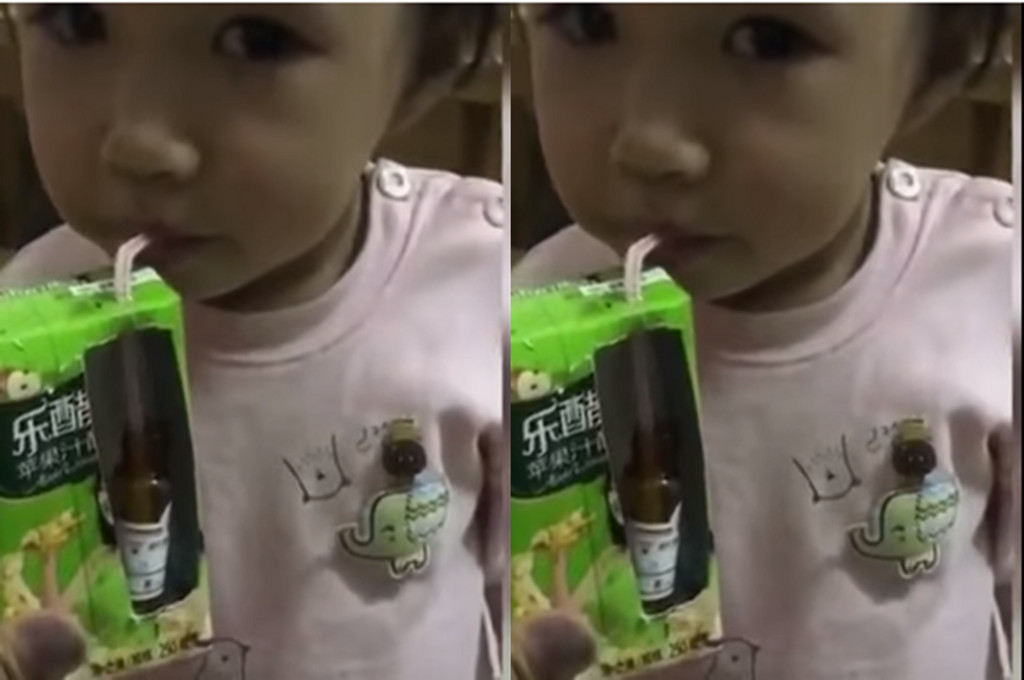 這則影片中,有一個看起來大約2、3歲的妹妹穿著可愛的粉紅裝,張著大大的眼睛,咬著吸管狂喝果汁,旁邊爸爸還是媽媽拿著鋁箔包的飲料,包裝上還看得見「蘋果汁醋」的字;妹妹專注力完全放在果汁上,吸得超級開心,眼睛偶爾抬起看一下爸爸媽媽,但嘴巴從來沒停過。