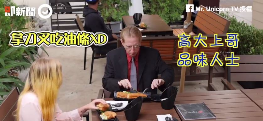 中美網紅「毒角SHOW」日前為了推廣中式平民美食油條,特別與國外一家高檔餐廳合作;主廚在向客人介紹時,還把油條說成是「中式皇家法棍」,早午套餐要價15美元(約台幣450元),聽起來超有氣勢。而酥脆的油條上桌後,甚至有老外用刀叉品嚐,直呼「太好吃了,無法相信!」