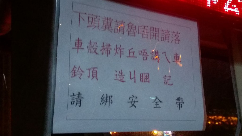 黃姓網友在台中搭乘公車,發現車窗上貼著一張台語告示,第一行依照讀字習慣,由左至右為紅字「下頭糞請魯唔開請落」,第二行開始轉為標楷體,寫著「車殼掃炸丘唔講ㄟ車,鈴頂造ㄐ睏記」,最後一行則變成黑色標楷體「請綁安全帶」,不只原PO霧煞煞,許多網友也都說只有最後一行看得懂。