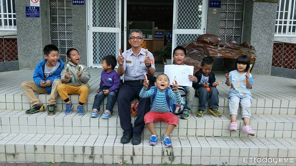 日前鸞山國小學童「突擊」鸞山派出所,站在派出所門外大喊「不給糖94要搗蛋」,所長胡松俊仁只好乖乖「繳糖」,但是要拿糖果,還必須上一堂課,內容包括婦幼安全、交通安全及反霸凌。