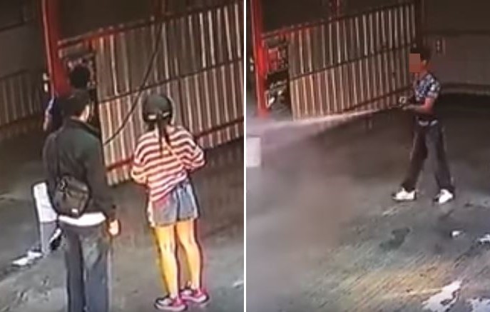 影片中,只見2男1女站在自助洗車場的其中一間隔間,裡面還停著一輛紅色的機車,穿著條紋上衣的短褲妹先是拿起手機朝高舉著高壓水槍的男子拍照,接著走向一旁滑手機,期間還有回頭看「水槍哥」到底在做什麼,就算發現對方正在用高壓水槍狂灌投幣機孔也沒阻止,最後騎上機車從容離開。