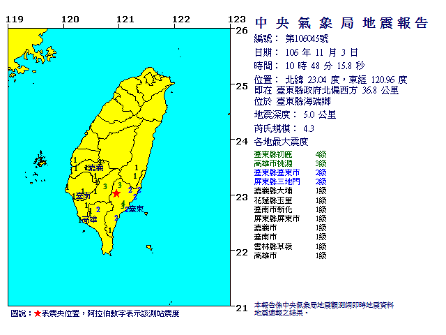 台東1分鐘內連兩震!根據中央氣象局的地震報告資料,台東縣海端鄉今天(3日)上午10時48分發生芮氏規模4.3地震,深度只有5公里,台東縣初鹿最大震度4級、高雄市桃源3級、台東縣台東市、屏東縣三地門2級、嘉義縣大埔、花蓮縣玉里、台南市新化、屏東縣屏東市、嘉義市、台南市、雲林縣草嶺、高雄市1級。