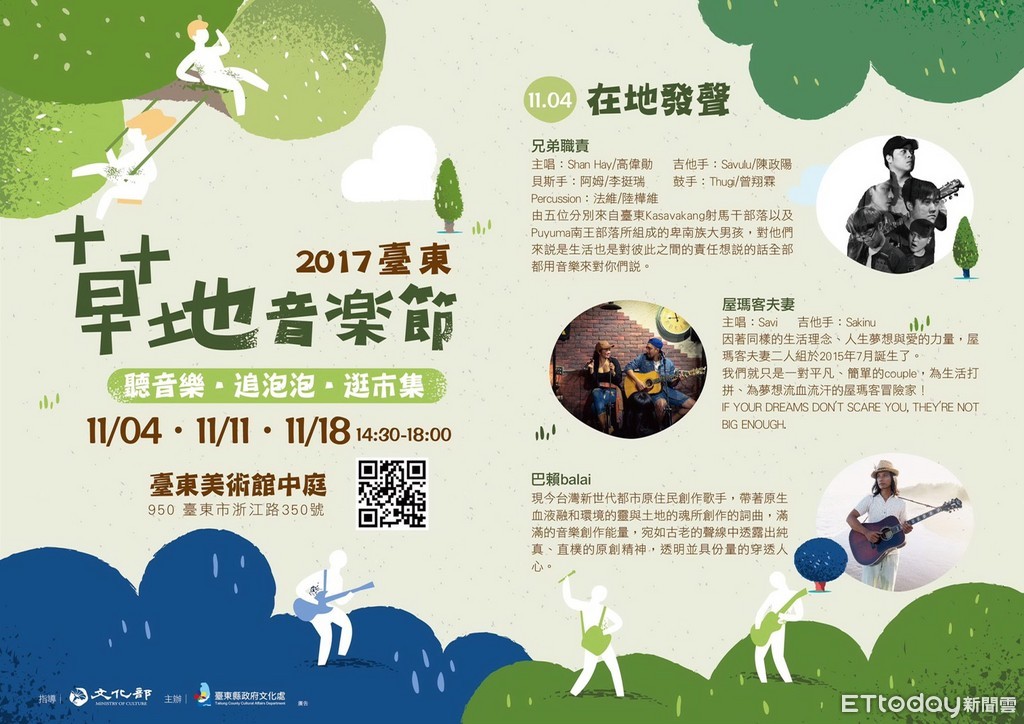 週末不知道帶小孩去哪裡踏青嗎?不知道去哪裡約會嗎?來2017台東草地音樂節吧!!「2017台東草地音樂節」即將於11月4日起連續三個週六下午2時30分於台東美術館中庭草皮登場。今年三週主題分別為在地發聲、午後呢喃、冬日爵醒,第一週將邀請金曲歌王巴賴、屋瑪客夫妻、兄弟職責現場演出。