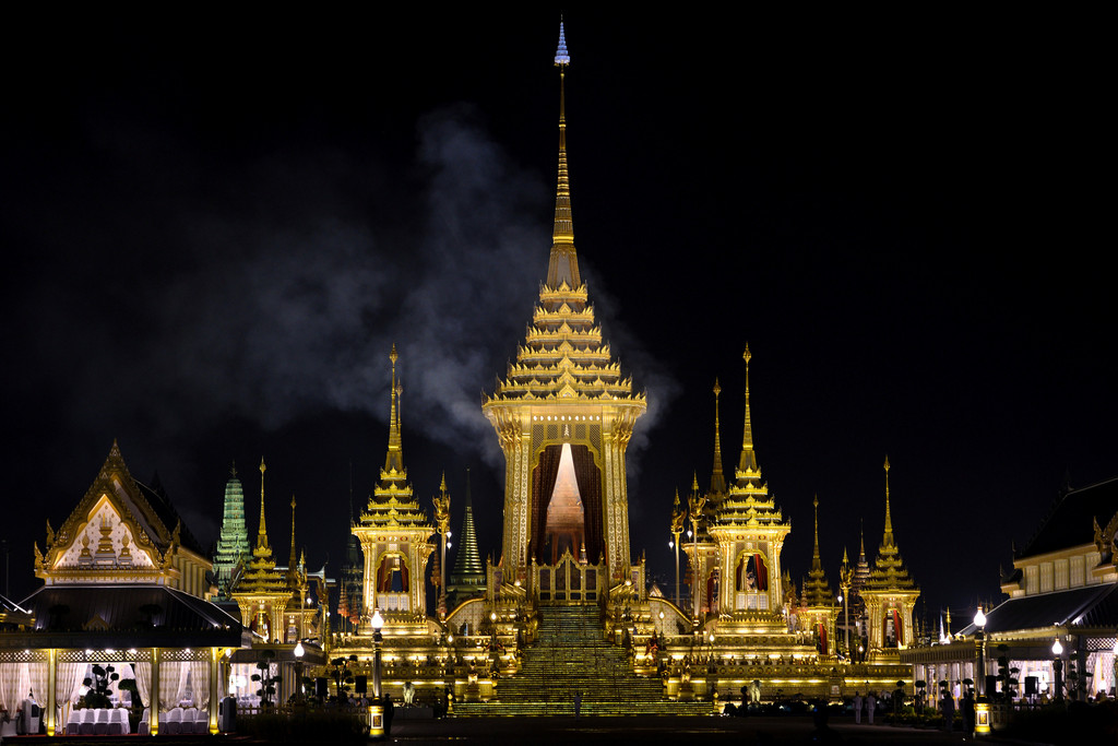 50公尺高的火葬亭坐落於曼谷皇家田廣場,設計概念源自佛教的「須彌山」,是眾神居住的神山,代表古王火化後將升天。周圍亦設有不少神獸及佛像雕像,造工精細,是座集合了全泰國頂級工藝師並保存傳統文化經典的藝術建築,雖名為火葬亭,但其建築規格直逼皇宮,整體金碧輝煌、氣勢恢宏,耗資10億泰銖(約新台幣9億元)建成。