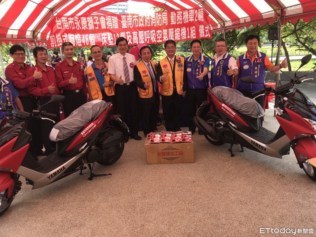 ▲台南市永康獅子會,捐贈台南市消防局勤務機車、救災裝備器材一批,4日上午10時,在永康區探索公園舉行捐贈儀式。(圖/消防局提供)