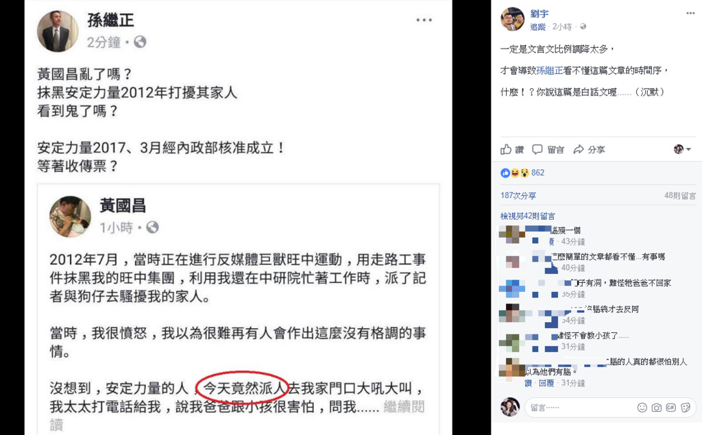 孫繼正也不甘示弱回擊,卻似乎沒看懂黃國昌貼文,竟稱其抹黑安定力量2012年騷擾他,但安定力量是在今年3月才經內政部核准成立,「等著收傳票?」隨後刪文但網友早已截圖,狠酸「閱讀障礙?」、「丞相,風吹歪了」、「看不懂白話文的男人」。