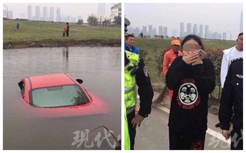 ▲女駕駛將超跑開入水塘,自行脫困後只受到些許驚嚇,身體並無大礙。(圖/翻攝自現代快報,下同)