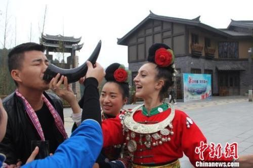 ▼穿著苗族服飾的中美給遊客敬酒。