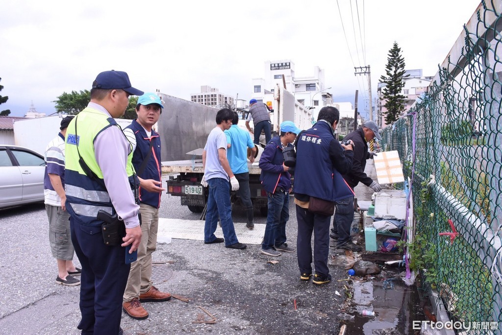 徐分隊長表示,為避免清運時有所爭議,執行作業過程現場攝影,確認無貴重物品且屬廢棄物後才清運上車,清運的物品包括保麗龍空箱、帆布、木頭、塑膠籃等,其中以水泥灌注的輪胎與桶子在搬運時最為吃力,需要三至四人搬動才能順利搬上車。