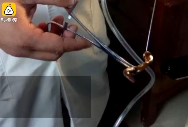 ▲醫生從吳男鼻子裡夾出一隻8公分長的水蛭。(圖/翻攝自梨視頻)