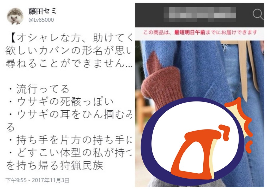 這位日本女網友於4日在推特寫道,「懂時尚的網友請幫幫我,我有一個很想要的包包,但想不起來名字是什麼,所以沒辦法詢問店員…!這個背包非常流行、長得像兔子屍體、拎起來像在揪著兔子的耳朵、2個提袋會扣在一起、像我這種體型龐大的人拎起來,就像是提著兔子屍體回家的狩獵民族。」