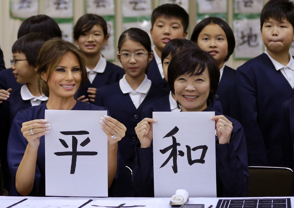美國總統川普正在展開訪亞行程,她的夫人梅蘭妮亞(MelaniaTrump)繼5日與日本首相夫人安倍昭惠逛珍珠旗艦店後,6日到了東京的京橋築地小學探訪。兩人更和小學生一起寫書法,分別寫下「和」、「平」兩個字。由於梅蘭妮亞初寫毛筆,但工整筆跡令人讚嘆,一點都不輸給安倍昭惠。