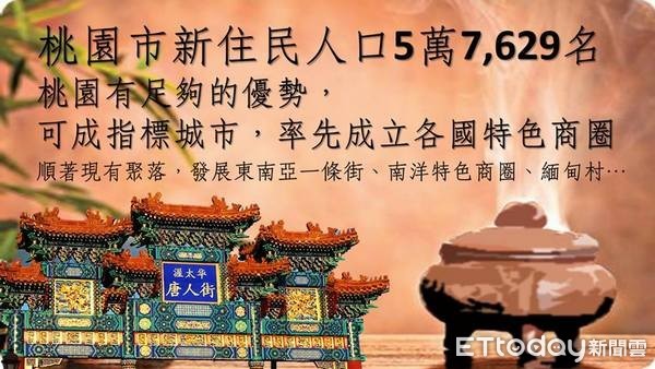 林政賢指出,桃園市新住民人口共5萬7,629名,占全台11%,全台比例最高,而政府推動新南向後繼無力,欲振疲乏,桃園有足夠的優勢,可以成為指標城市,首先桃園市應該率先成立各國特色商圈,世界各國中,美、加、日本都有ChinaTownh(華人街),桃園或許可以參考順著他們的現有聚落,成立諸如東南亞一條街、南洋特色商圈、或是緬甸村,或是新闢一個地點成為他們的聚落商圈,例如:後站打造成東南亞形象商圈。