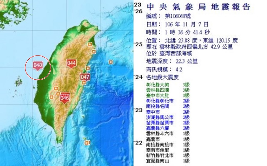 台灣時間7日深夜1時36分,發生芮氏規模4.2地震,中央氣象局地震測報中心指出,震央位置在雲林縣西偏北方42.9公里處,位於台灣西部海域,震源深度22.3 公里。對此,網友快速在臉書分享地震休息,雲林網友心有餘悸說:「有聽見地鳴聲,然後推一下…。」、「聽到轟隆的聲音之後開始搖晃,有點可怕。」