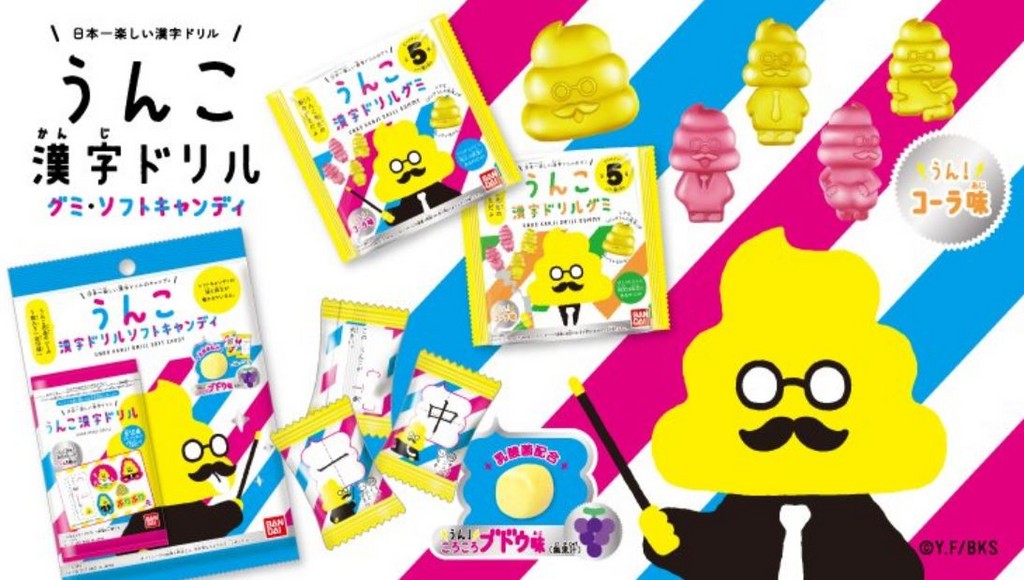 為了讓孩子趣味學習,日本出版商文響社(Bunkyosha)曾在今年春天推出「大便漢字教科書」,以糞便形狀的圖文包裝較生硬的語言學習,獲得好評。現在,萬代玩具公司食玩部BANDAI Candy順應熱潮,推出「大便漢字糖」;小孩在品嘗它的汽水甜味時,還可以翻到包裝背後閱讀漢字。
