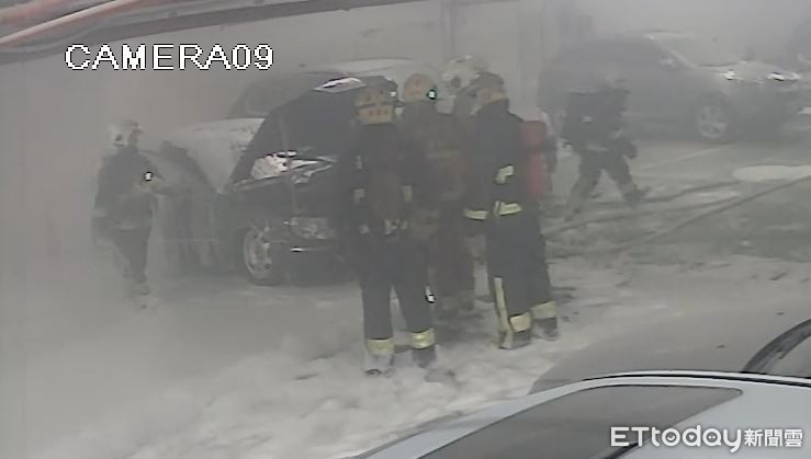 ▲停車場內地板全是消防泡沫,消防人員圍在起火的賓士車旁。(圖/記者陳豐德翻攝)