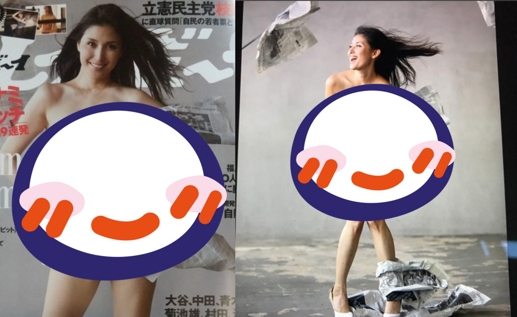 日本知名寫真女星橋本愛實因為擁35G的傲人上圍,加上神秘的熟女氣質而獲得「國民情婦」的稱號,33歲的她近來登上最新一期雜誌《Weekly PlayBoy》的封面,全身幾乎全裸只用報紙遮住重要部位,性感又大膽的造型再度引起話題。