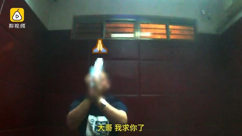 ▲男子雙手合十頻頻拜託警方讓他接老婆的電話。(圖/翻攝自梨視頻)