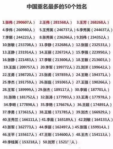 中國人口有13.8億,遇到同名同姓的情況其實十分常見,近日一份「中國最常見名字前50」名單公佈,榮登第1名的超級菜市場名是「張偉」,共有近30萬人使用這個名字。