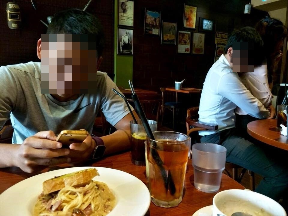 高雄一位男網友於「爆廢公社」發文抱怨,只是假日來吃一頓早午餐,隔壁桌穿著上班族裝扮的一男一女卻打得火熱,就算只看照片也能看出滿滿的激情,連女生講電話時,男生的頭也黏在對方的胸部前方,不浪費一分一秒。